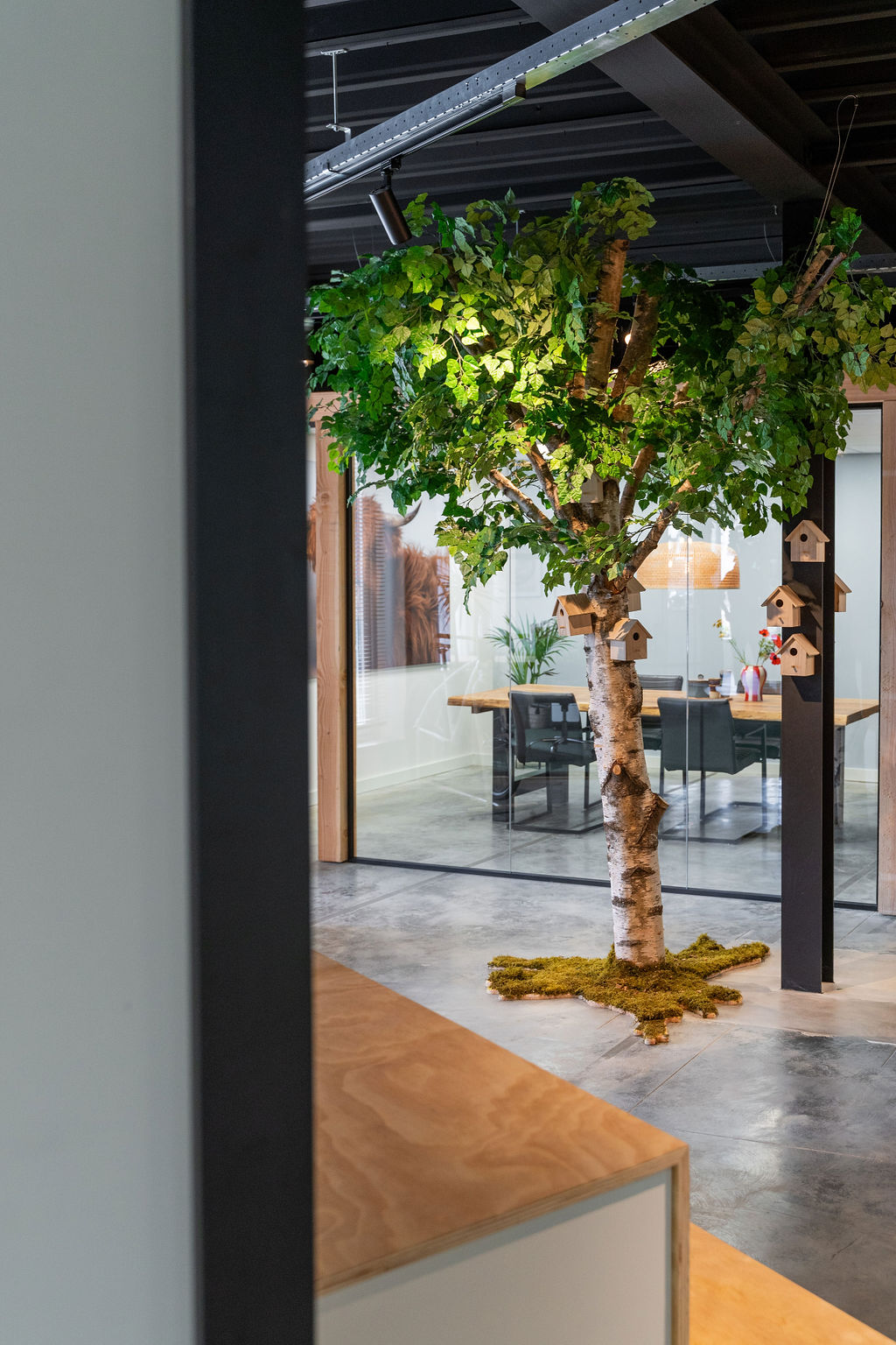 met een houten podium voor presentaties. De boom maakt de beleving compleet!